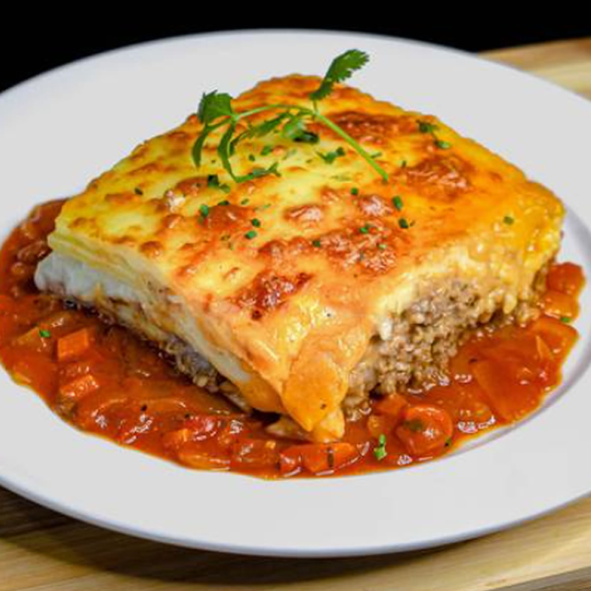 Pino de carne de vacuno, laminas de pasta de lasagna, salsa bechamel entre capas, queso en la parte superior para gratinar. (Acompanado de un consomé o una ensalada, además de un pancito) (cubierto si lo necesita) (empaque c-10 alumunio). Consomé de pollo en todos los platillos. Ensalada, tomate, cebolla y lechuga en todos los platillos. Los empaques que se mencionan son para llevar.